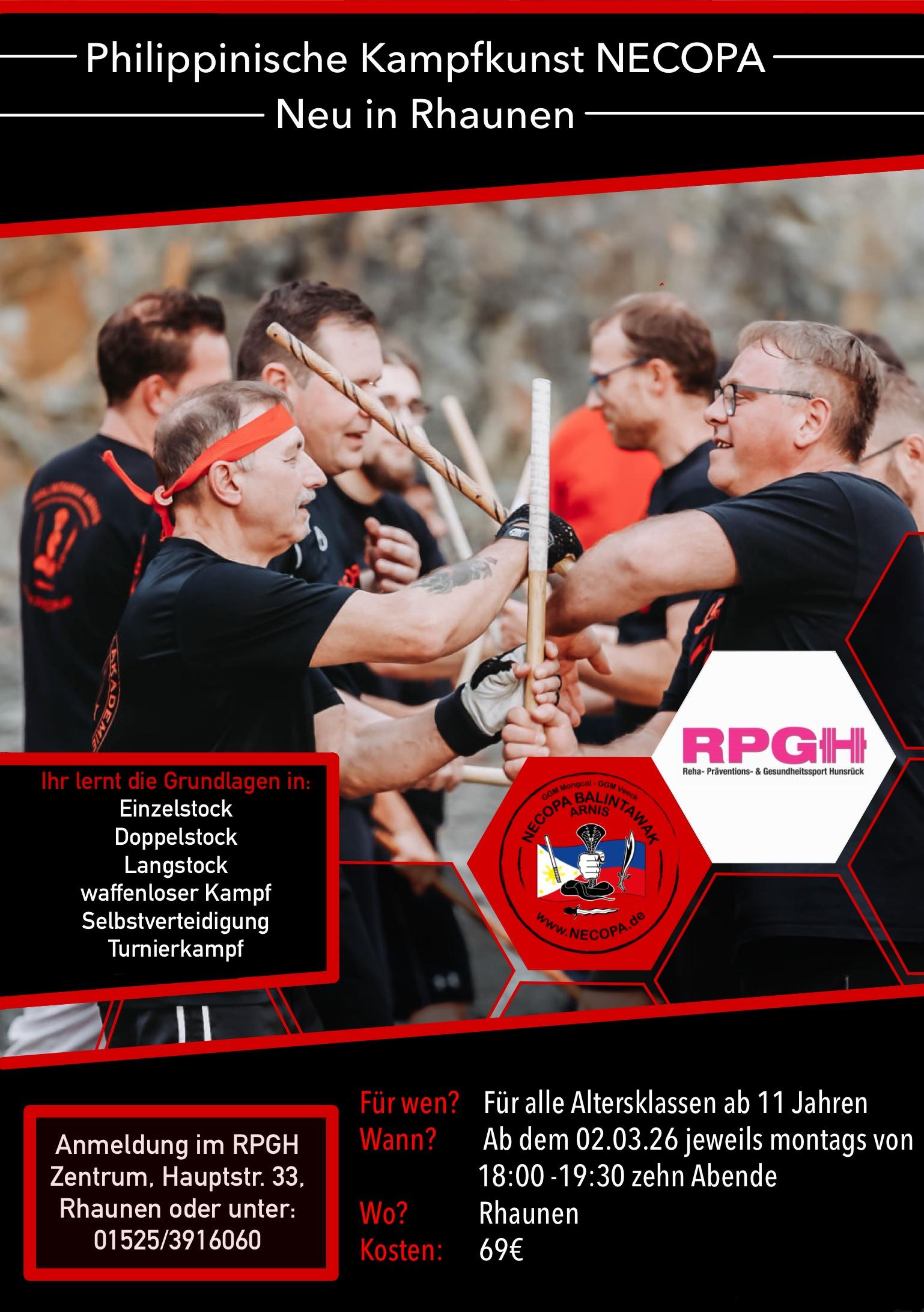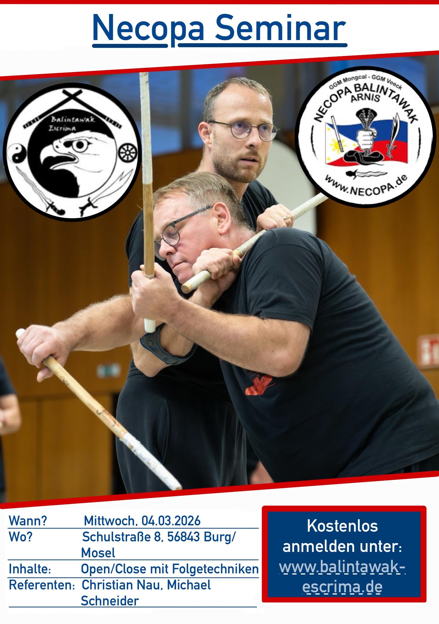 In Zusammenarbeit mit der Balintawak Escrima Schule Traben-Trarbach findet am 04.03.2026 ein NECOPA Kurs in Burg (Mosel) in der Zeit von 19.00 - 21.00 Uhr statt. Anmeldungen erfolgen ausschließlich über...