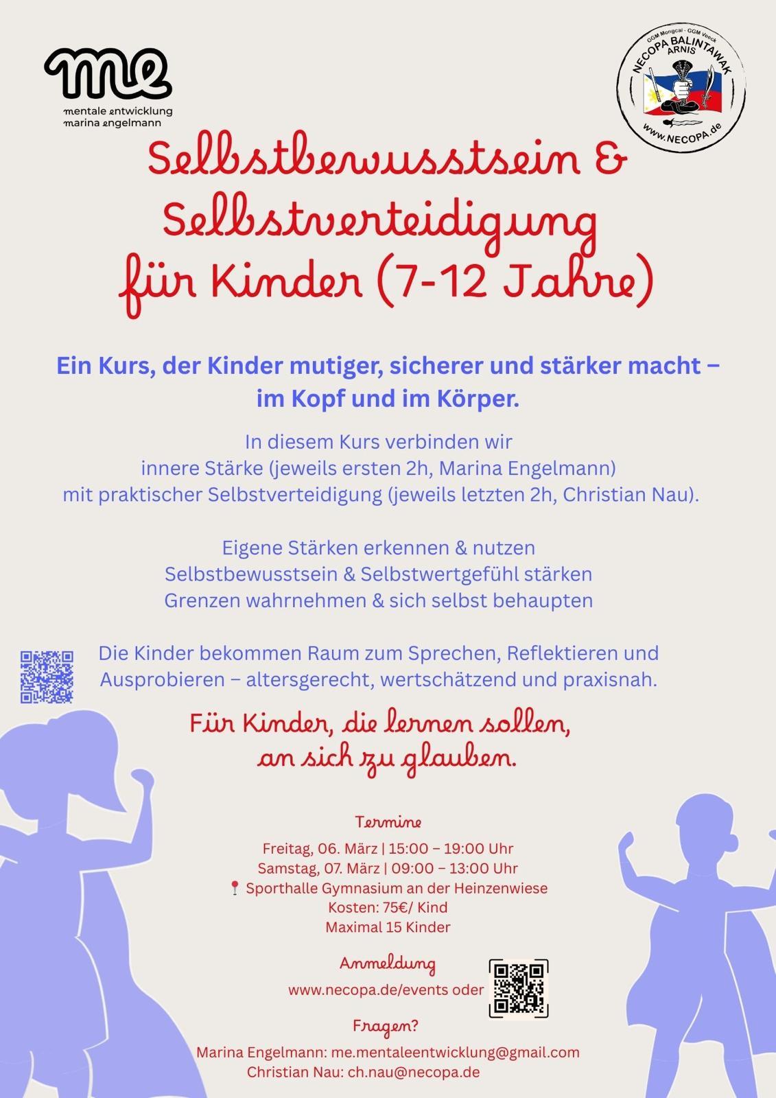 Der Kurs Selbstbewusstsein & Selbstverteidigung für Kinder im Alter von 7 - 12 Jahre bietet die "NECOPA-Balintawak" zusammen mit "ME" (Mentale Entwicklung - Marina Engelmann) an. Profitiert von einem Resilienztraining...